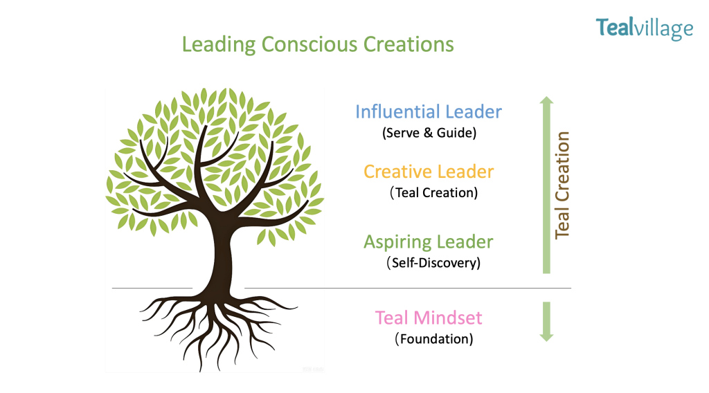 Inspired by the principles of Teal organizations—self-management, wholeness, and evolutionary purpose—our approach mirrors a natural cycle. Leading a conscious life or business is like nurturing an apple seed into a fruit-bearing tree. As we practice leading and creating, we turn ideas into reality, making the invisible visible. Our sphere of influence grows with our capabilities, expanding from leading ourselves to guiding families, projects, teams, organizations, and beyond.